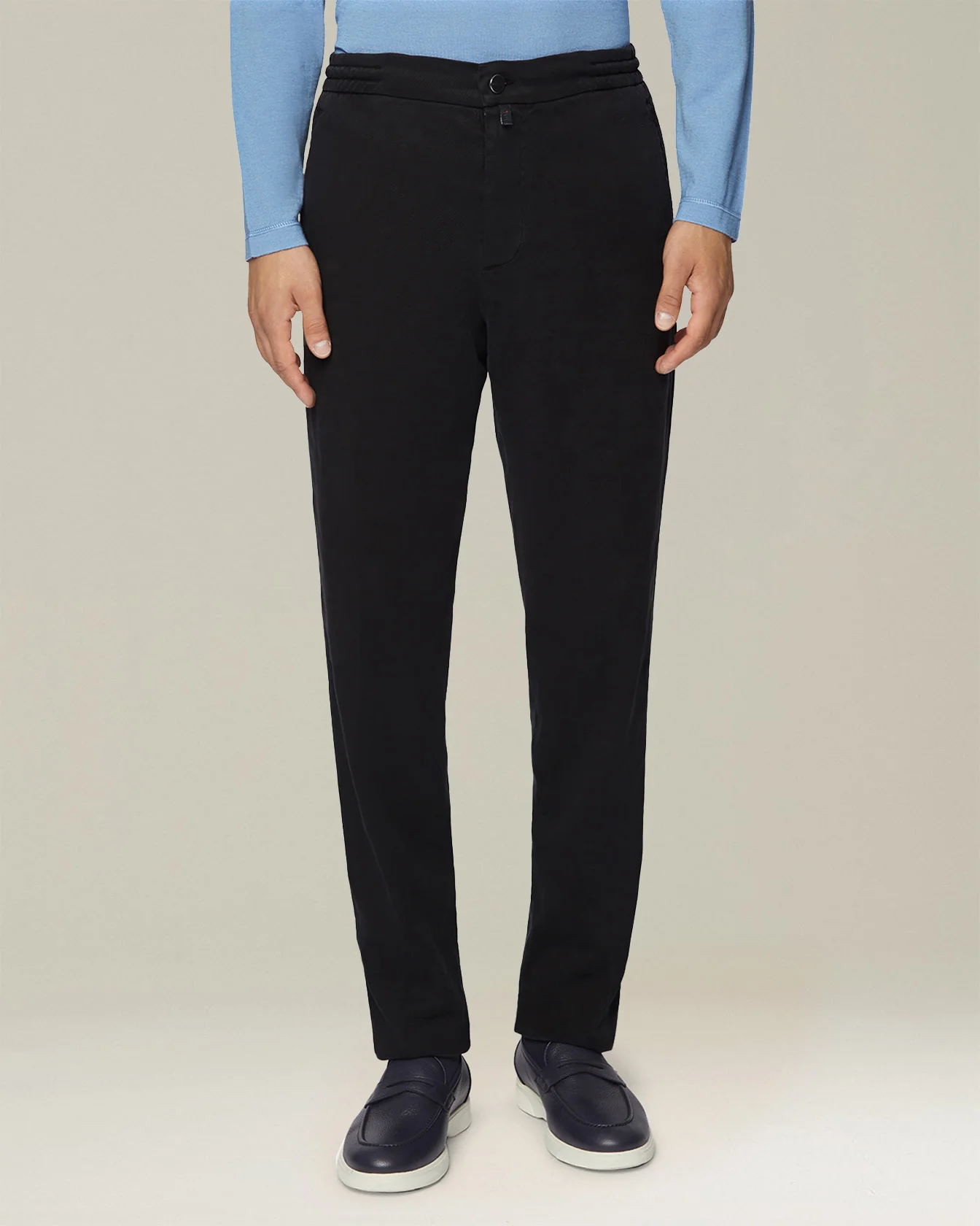 A staple in a man’s wardrobe and an icon of casual style, Kiton trousers are reinvented in an even more casual version with a loose, relaxed fit. Crafted from a high quality blend of Lyocell and cotton, the trousers offer an unrivalled soft, flowing feel. Welt pockets and a French dart add a touch of sophistication, while the adjustable elasticated waistband with drawstring, complemented by a laser-cut Kiton fastener, ensures a customised fit. The presence of a small amount of elastane makes the trousers extremely comfortable, adapting smoothly to the leg without sacrificing shape. This model combines comfort and style, promoting a culture of relaxed elegance that strikes a perfect balance between sophistication and practicality, ideal for elegant travel.