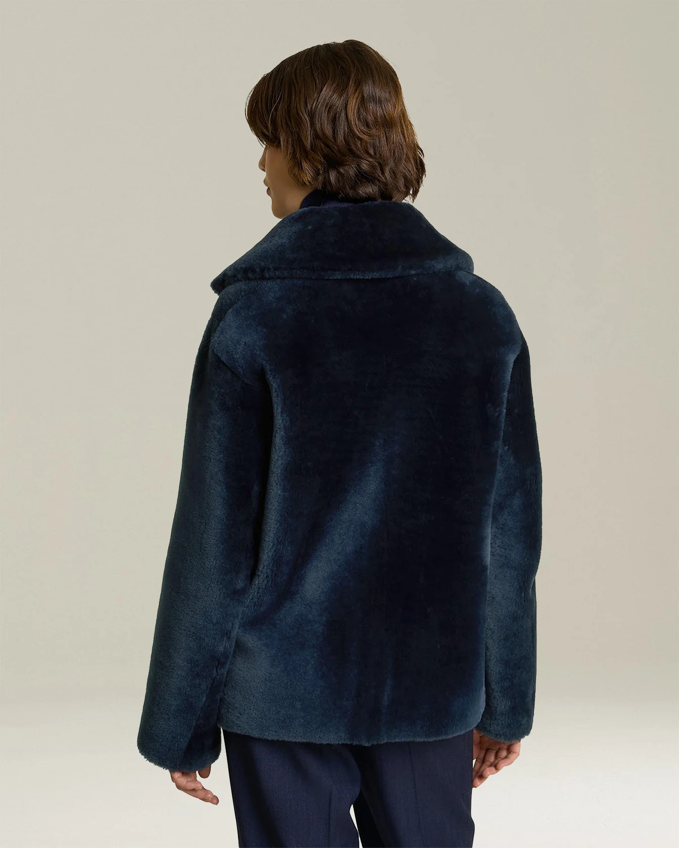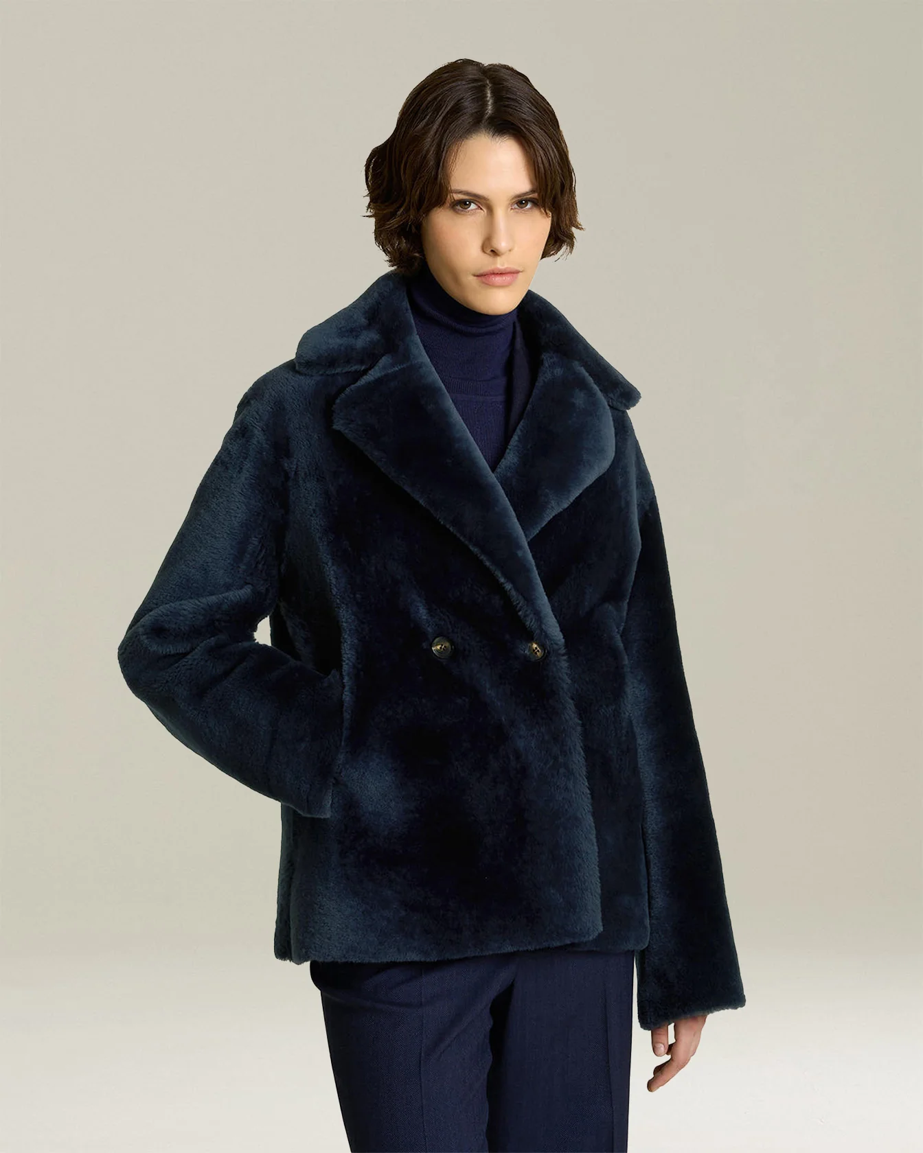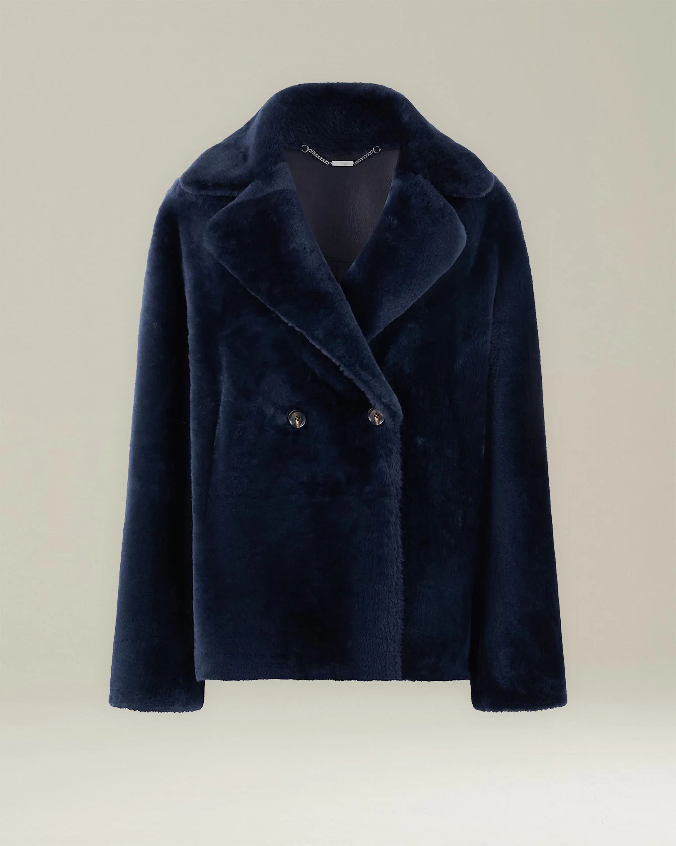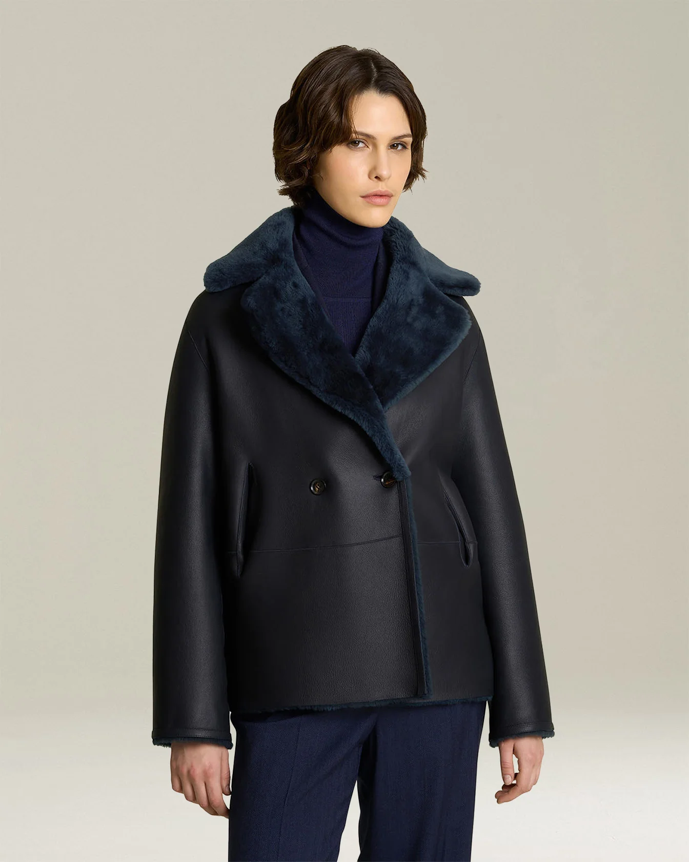 The soft, enveloping lines enhance the luxurious comfort of this reversible shearling jacket. The soft fur offers a warm, pleasant feel, providing an unparalleled experience. The side of the sheepskin with a nappa finish has a smooth and finely polished texture. This garment features a double-breasted design with two buttons and a comfortable fit, complemented by classic lapels. The two pockets set into the seams add a contemporary touch to this sophisticated garment.